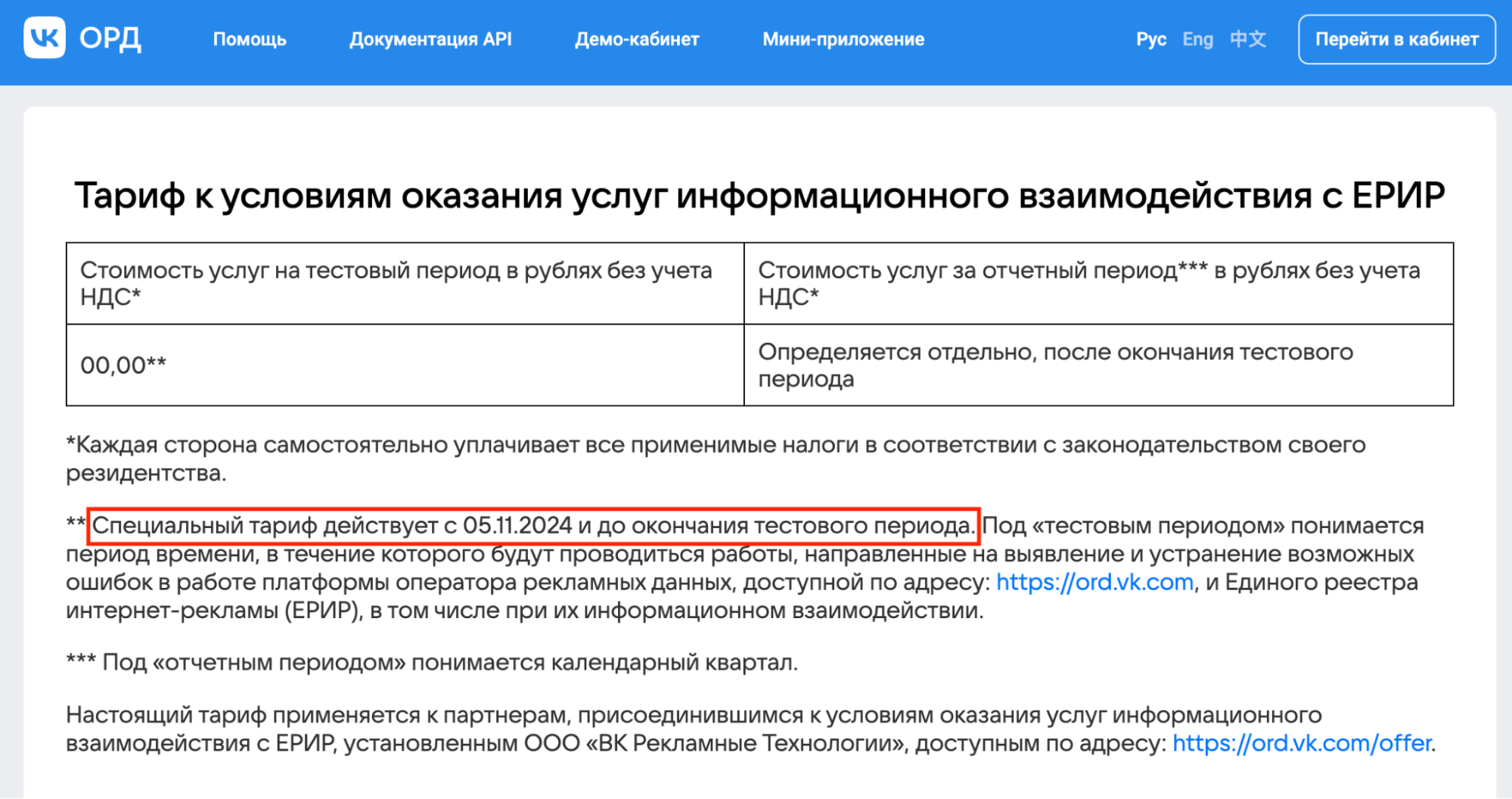 В сообщении сервиса отмечается, что с указанной даты планируется обновление правил использования функционала ОРД VK, включая изменение тарифов. В компании пояснили, что корректировка связана с завершением тестового периода работы продукта.