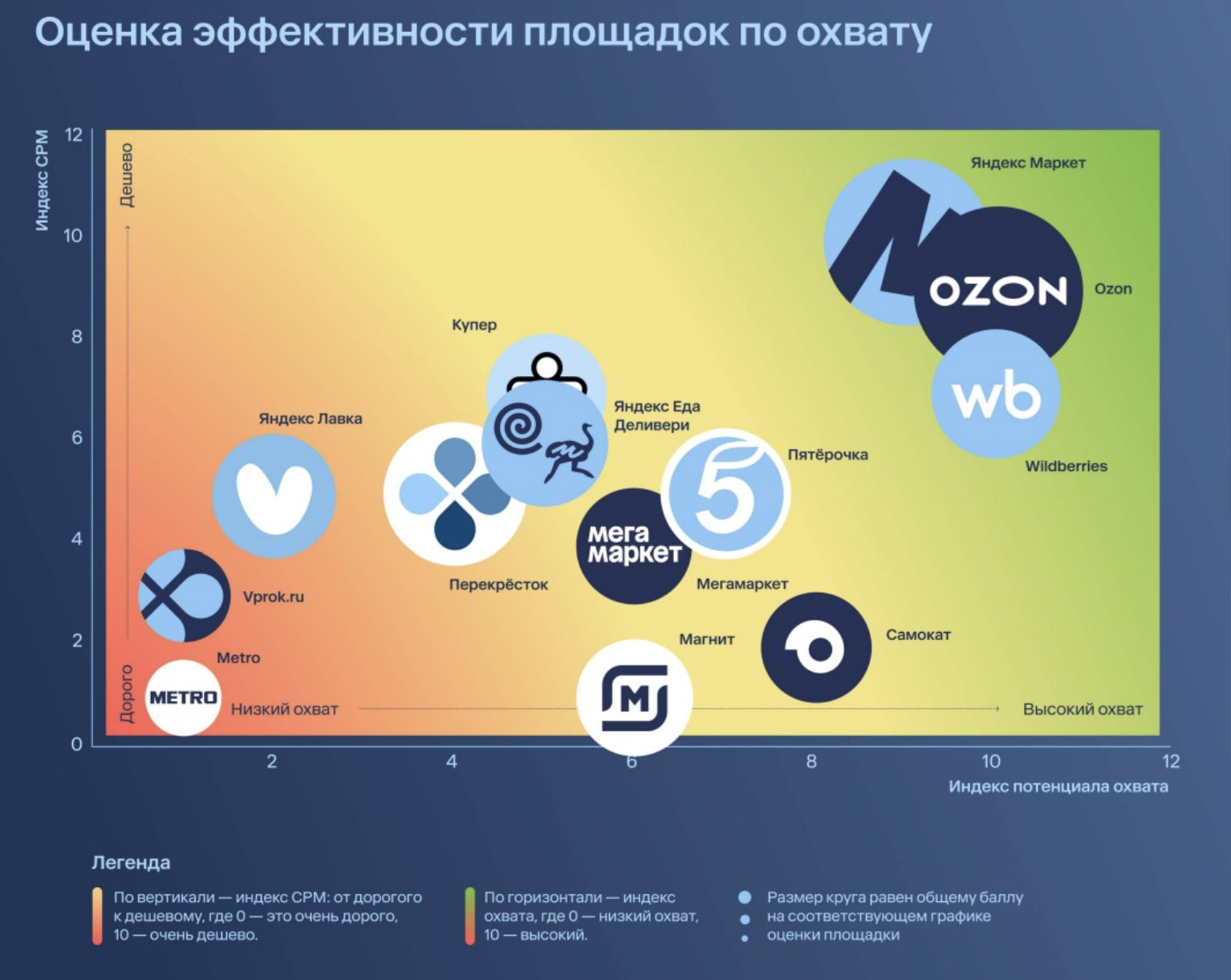 Среди брендов с самыми сильными рекламными и маркетинговыми возможностями выделяются Ozon, Пятерочка и Деливери. По оценке экспертов, для задач брендирования и широкого охвата аудитории наиболее эффективны Ozon, Wildberries и Яндекс Маркет. В то же время максимальный потенциал для увеличения конверсии и продаж демонстрируют Пятерочка, Самокат и Яндекс Лавка.