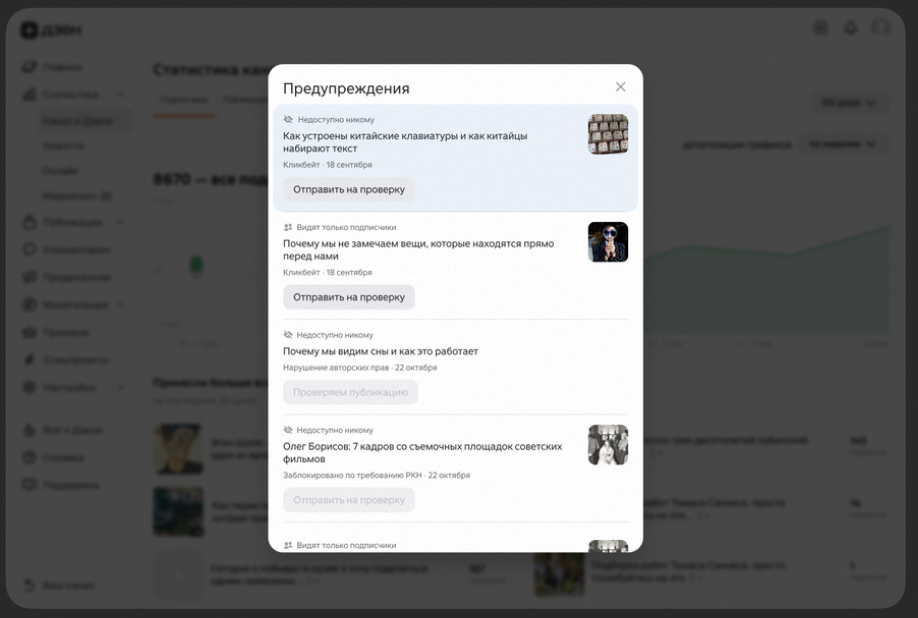 В Дзене появилась возможность отправить материал на повторную проверку в один клик — если он не прошел автоматическую модерацию и получил ограничение рекомендаций.