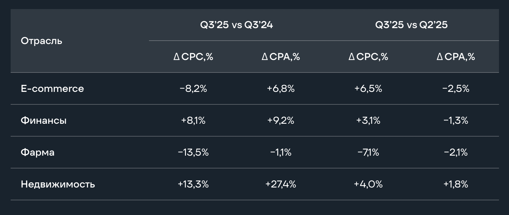 - финансовый сектор остается стабильным: в третьем квартале CPC вырос на 3%, а CPA уменьшился примерно на 1%. На ситуацию повлияли макроэкономические факторы: Банк России дважды снизил ключевую ставку, установив ее на уровне 17% годовых к концу квартала, что поддержало кредитную активность и спрос;