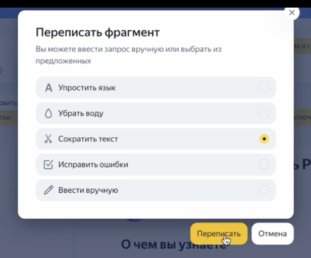 Во время сравнения версий можно воспользоваться встроенным искусственным интеллектом: выделить нужный фрагмент, нажать «Улучшить» и задать задачу, например сократить текст, изменить стиль или добавить примеры. Система предложит альтернативный вариант рядом с оригиналом.