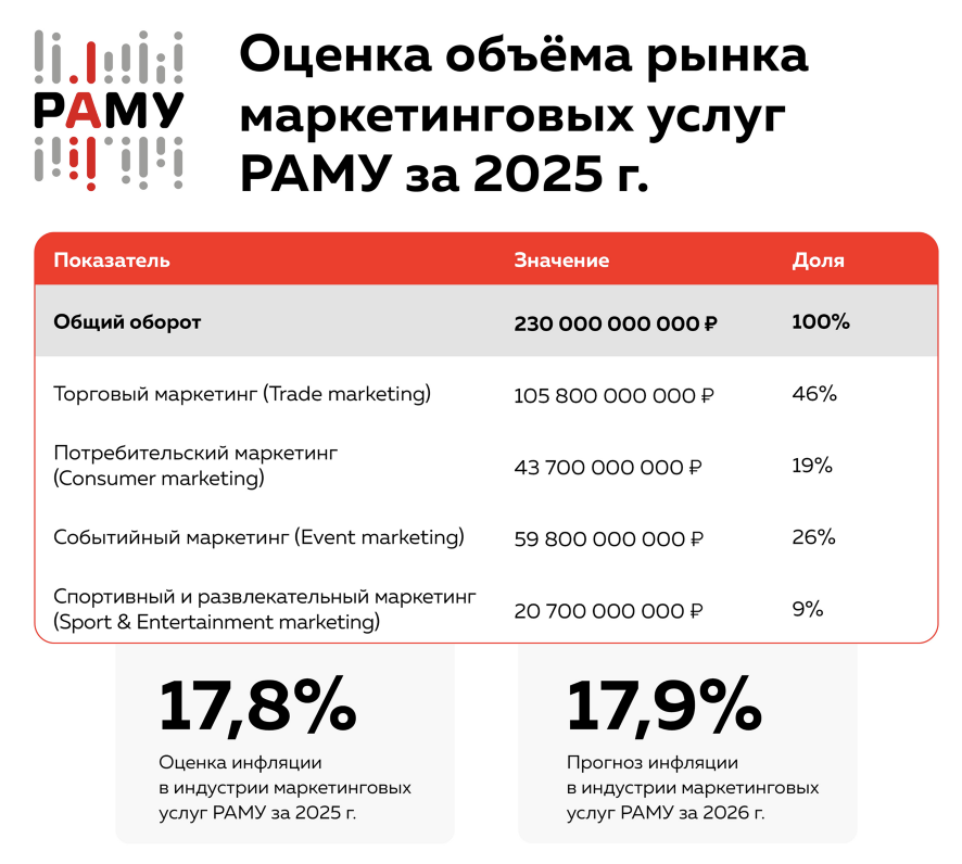 Российская ассоциация маркетинговых услуг (РАМУ) обновила оценку объема рынка. Согласно новой комплексной методике, в 2025 году рынок достиг 230 млрд рублей — это на 80% больше по сравнению с показателями 2024 года.