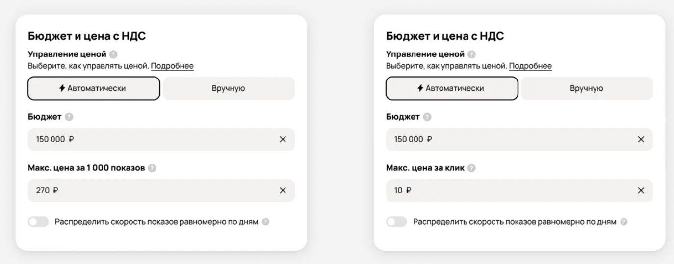 Чтобы включить функцию, рекламодателю нужно задать дневной бюджет и максимальную стоимость клика или тысячи показов. После этого алгоритмы будут автоматически менять ставки внутри указанного диапазона, снижая их, если есть возможность привлечь трафик дешевле. Максимальное значение при необходимости можно изменить — обновление настроек занимает до десяти минут.
