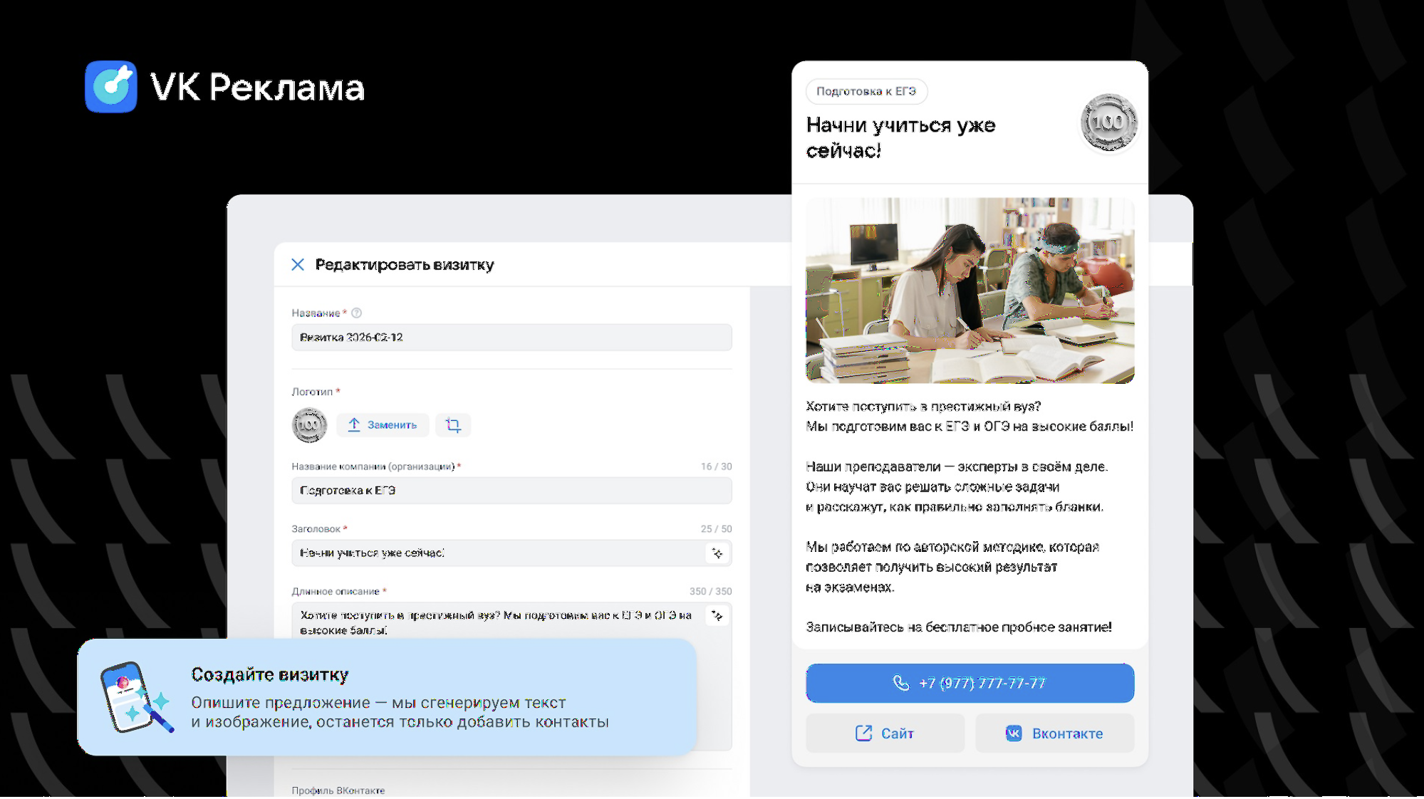 VK Реклама представила новый формат — «Визитки». Он доступен в смарт-кампаниях и служит упрощенной альтернативой лид-формам: это мини-страница, которая автоматически создается на основе краткого описания товара или услуги.