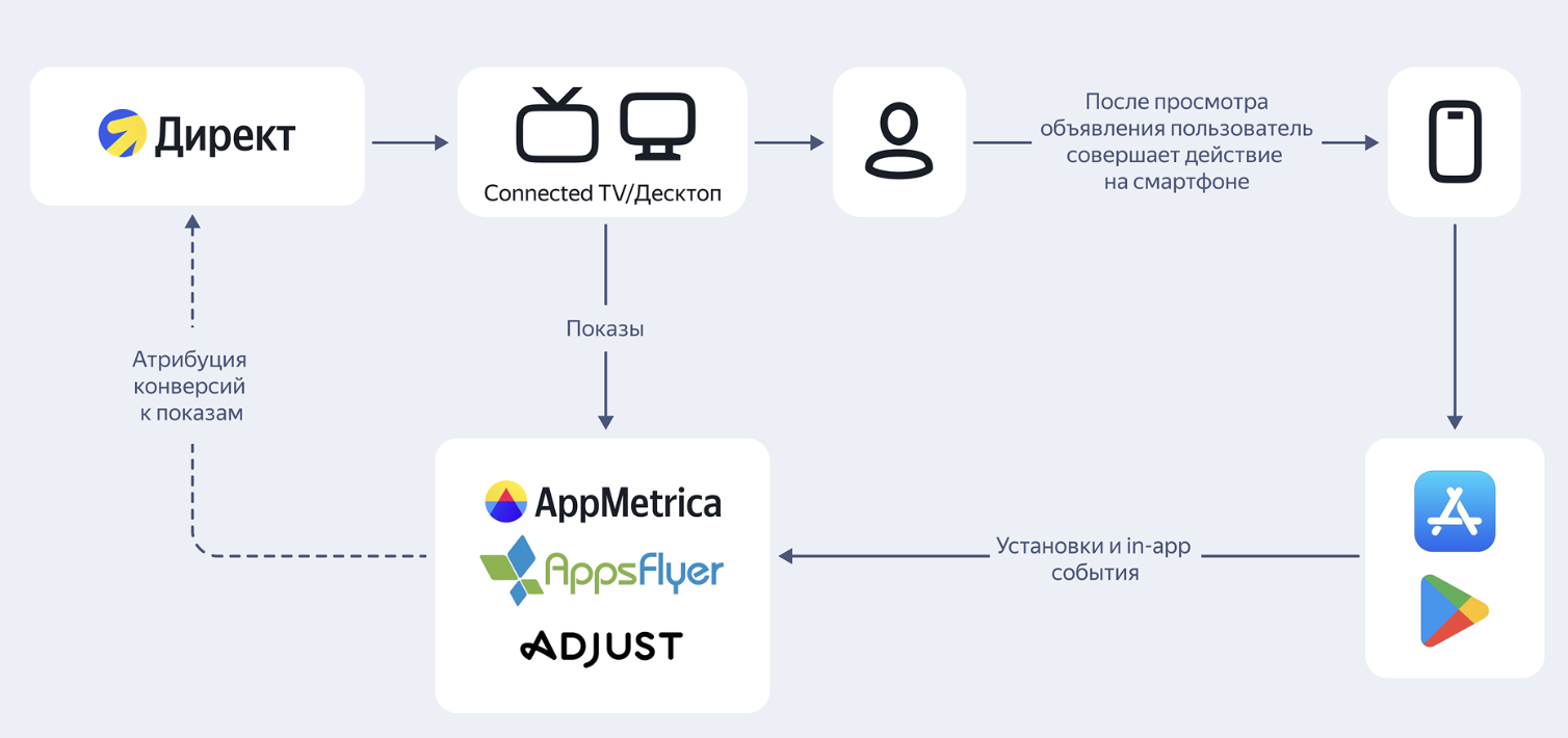 При запуске кросс-платформенных кампаний доступна атрибуция по показам (VTA), позволяющая фиксировать установки и конверсии, произошедшие после просмотра рекламы. Кросс-девайс атрибуция уже работает с трекерами AppsFlyer и Adjust, а скоро станет доступна и в AppMetrica.