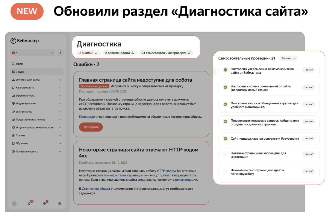 Яндекс представил обновленную версию раздела «Диагностика сайта» в сервисе Вебмастер. Теперь все проверки собраны в одном чек-листе, тогда как раньше информация была разбросана по нескольким разделам, и вебмастеру приходилось переключаться между разными страницами. Обновленный интерфейс упрощает работу и делает диагностику более наглядной.