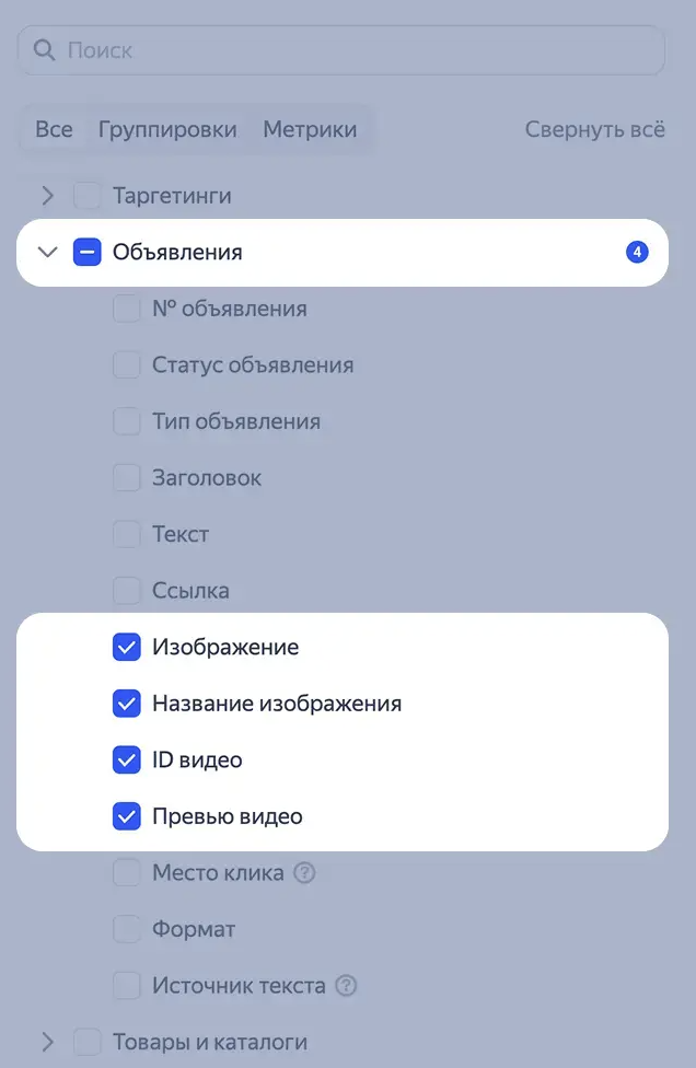 С учетом отзывов пользователей функциональность сервиса расширили: в обновленном Мастере отчетов появились новые группировки — «Изображение», «Название изображения», «ID видео» и «Превью видео».