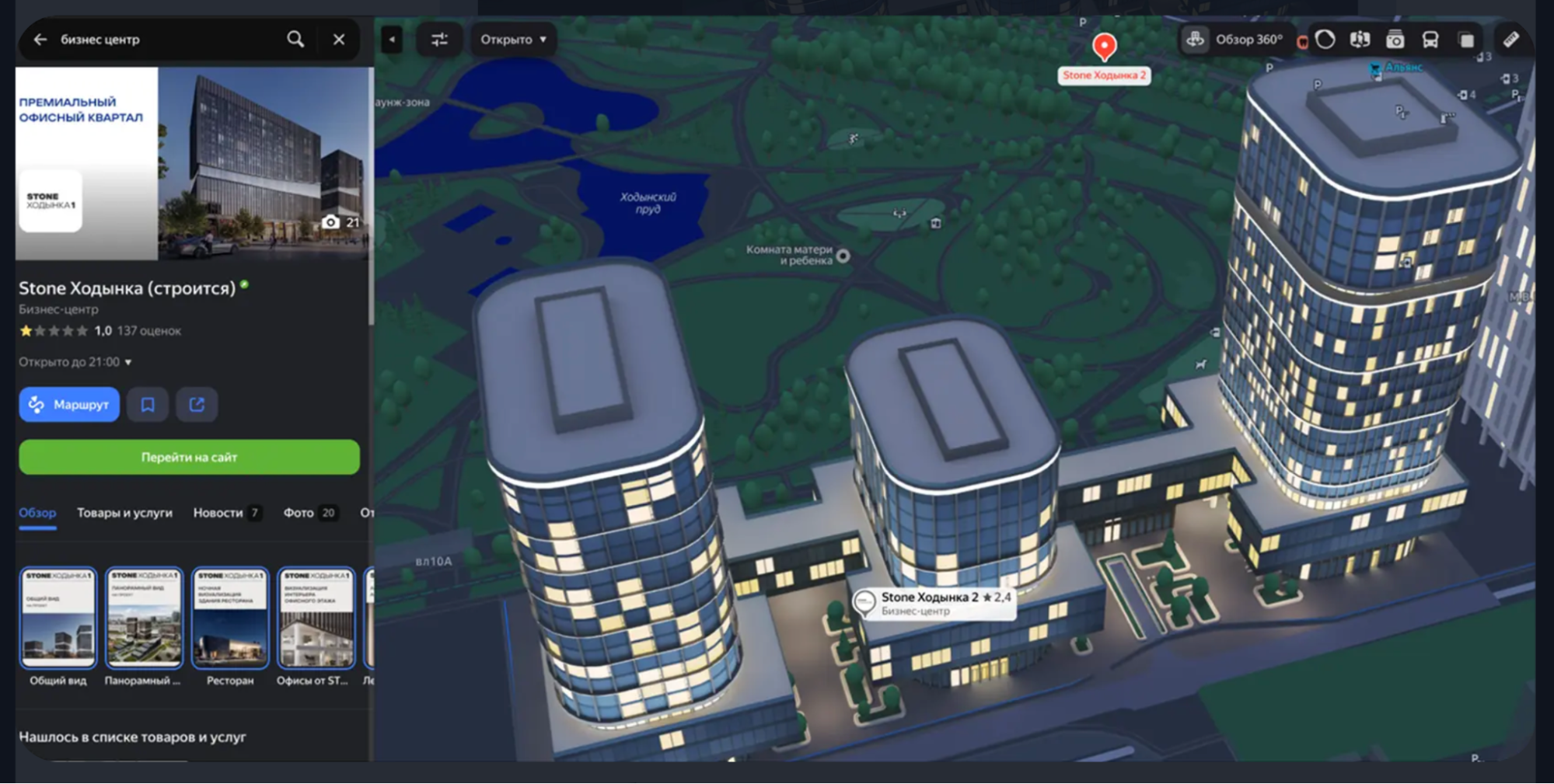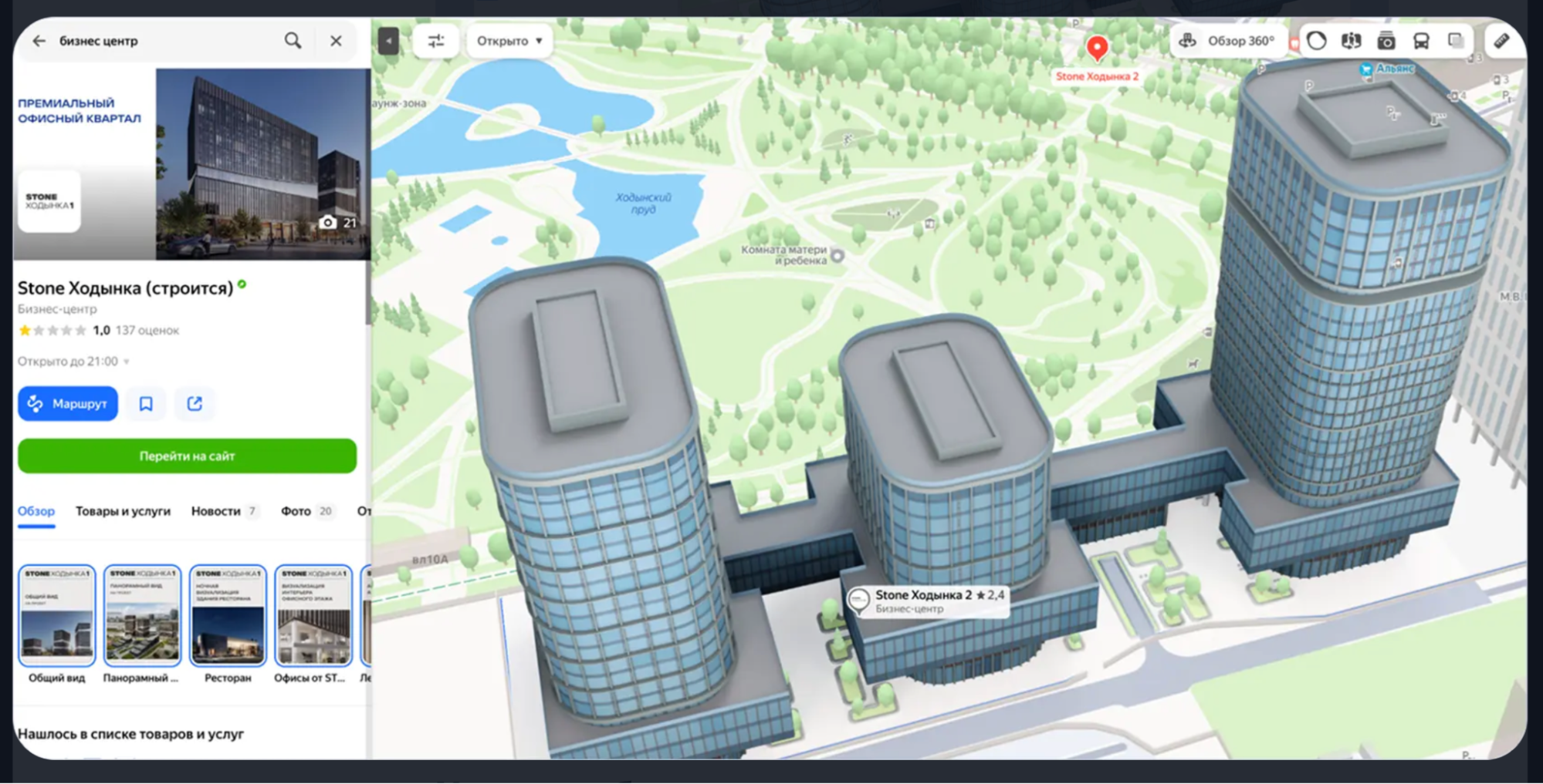 В поиске и на карте рядом с логотипом бизнес-центра теперь отображается кликабельная метка «3D-макет», которая упрощает поиск объектов с визуализацией. Дополнительно компании получают POI-метку с логотипом, отображаемую даже без поискового запроса.