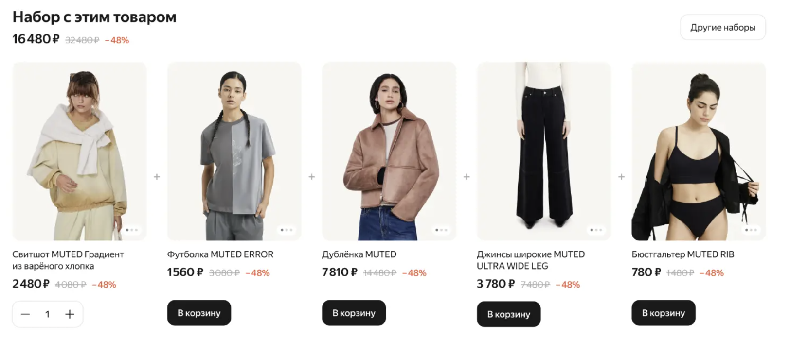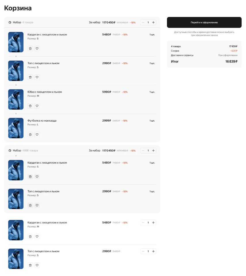 Теперь достаточно указать базовые настройки — и акционные наборы автоматически появятся на страницах соответствующих товаров. Покупатели увидят предложения прямо в карточке товара, а при добавлении в корзину комплект будет отображаться единым блоком, что упрощает восприятие выгоды.