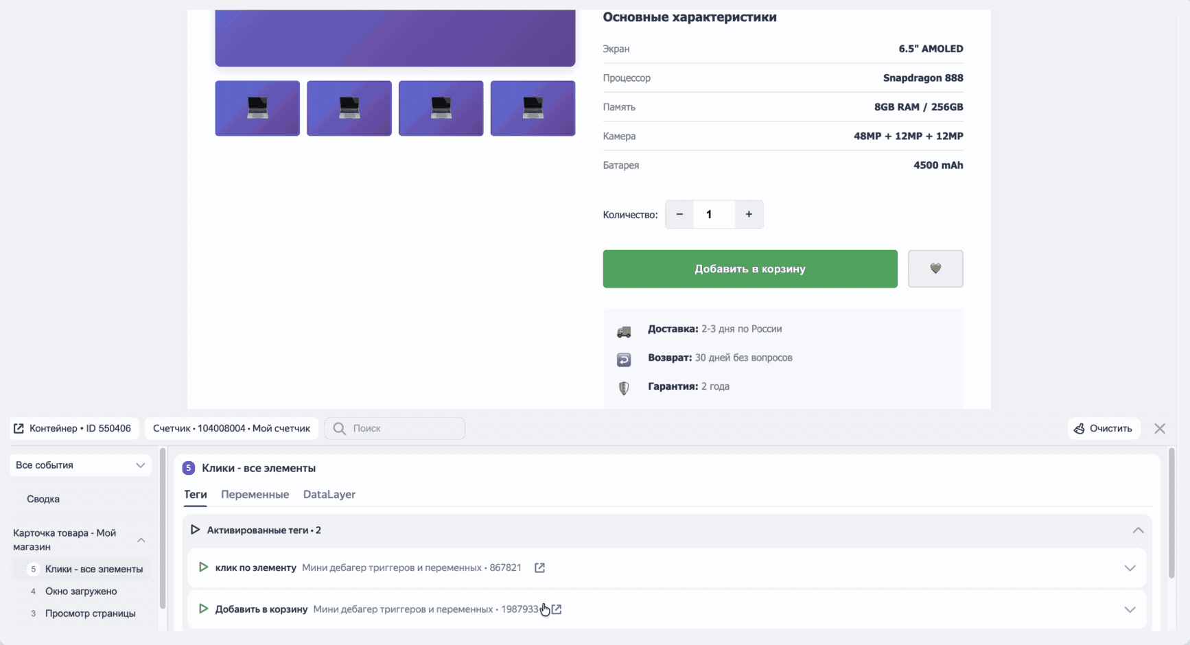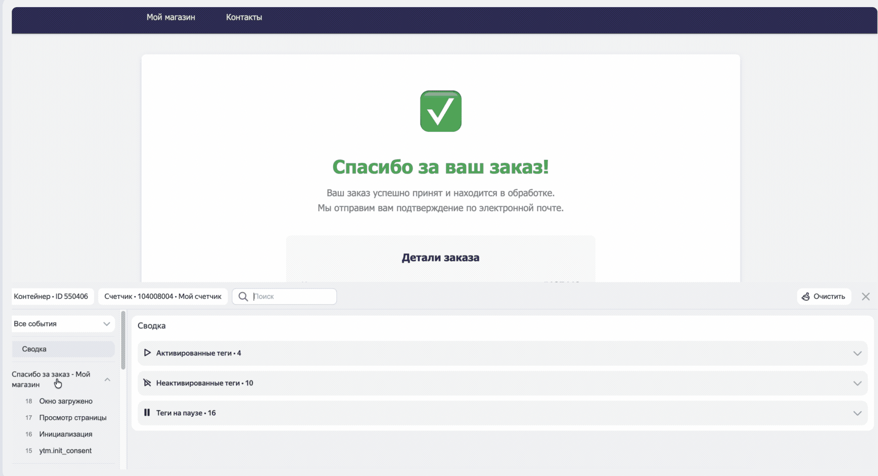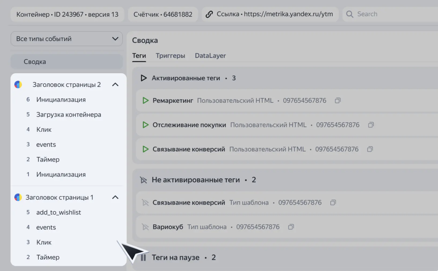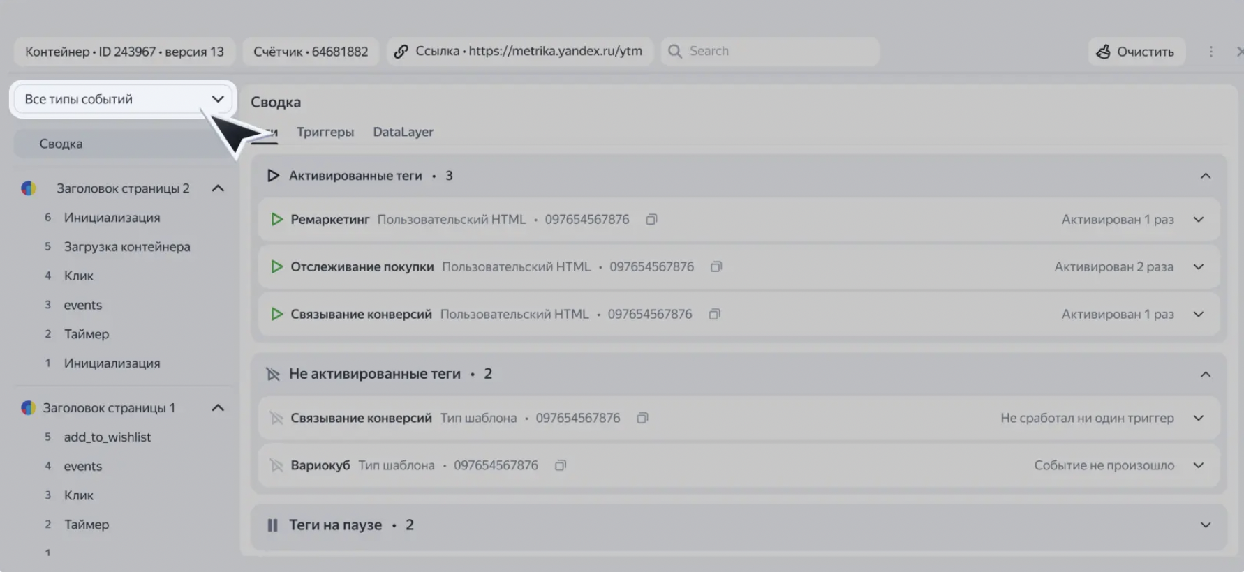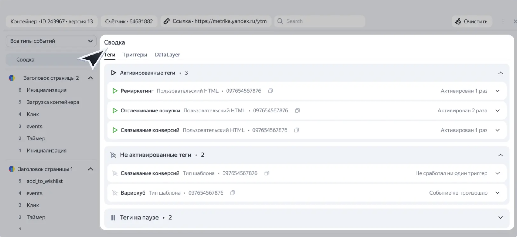 3. Сводка. Во вкладке «Сводка» собрана информация обо всех действиях с тегами в рамках одной сессии: видно, какие теги сработали, а какие — нет, а также доступны переходы к связанным событиям.