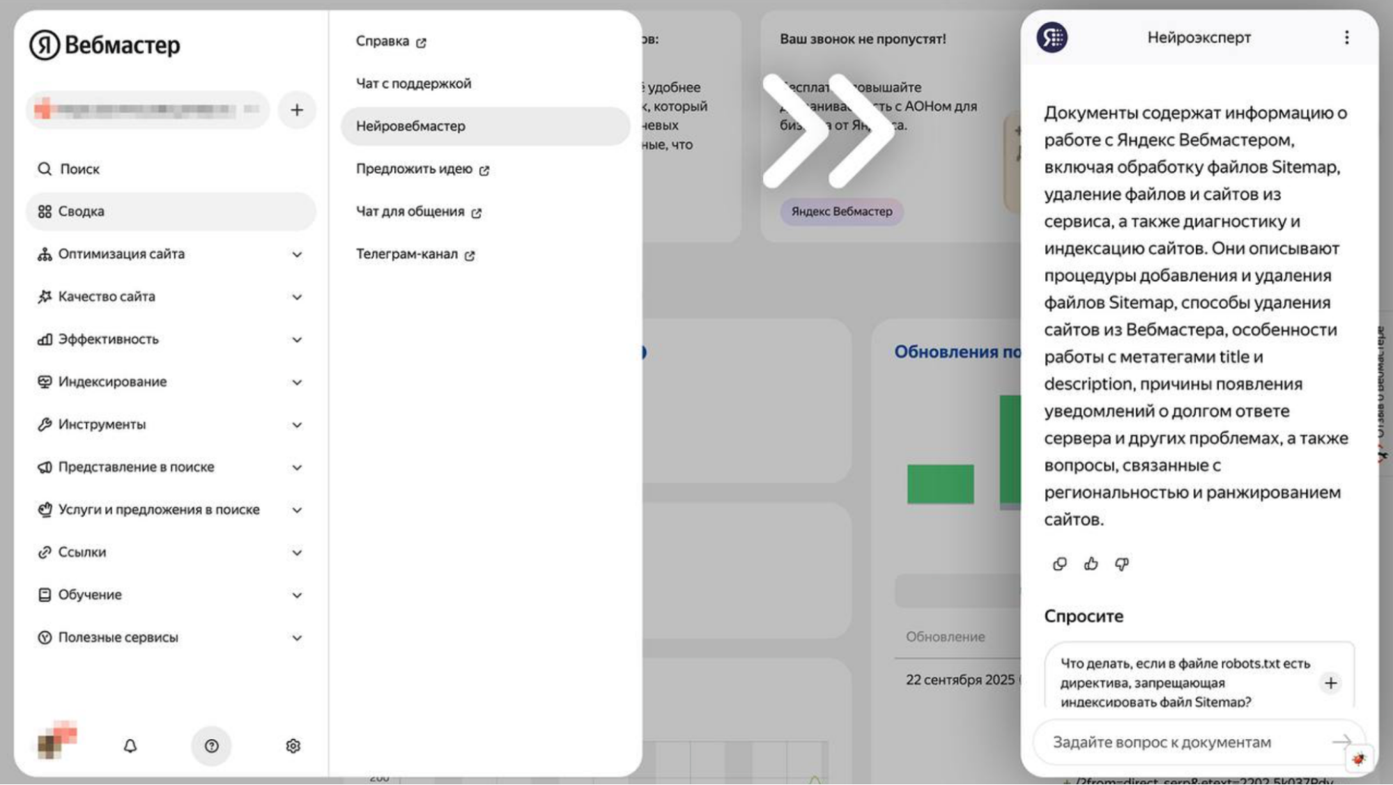 Теперь в Яндекс Вебмастере доступен новый ИИ-виджет — Нейровебмастер. Он помогает разобраться в работе сервиса и подсказывает, как оптимизировать сайт под поиск Яндекса.