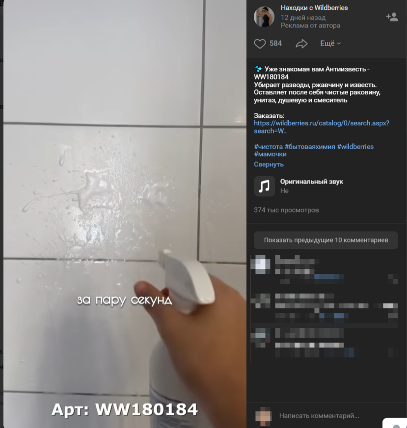 Кейс. Блогер демонстрирует эффективность рекламируемого моющего средства, рассказывает о его преимуществах и указывает ссылку и артикул товара на Wildberries: