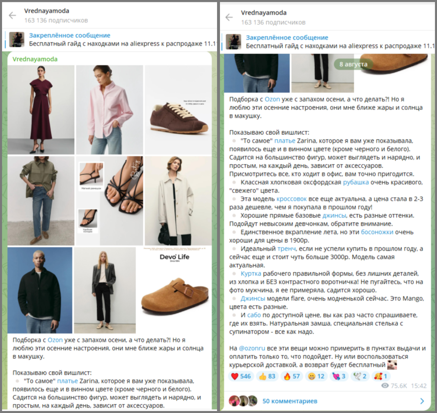 Кейс. Автор блога с ежедневными рекомендациями одежды из разных магазинов создала тематическую сезонную подборку товаров с Ozon, включив в нее вещи, которые уже упоминала ранее. Такой подход создает ощущение искренности и пользы, а не прямой рекламы: контент связан друг с другом, а у аудитории формируется доверие к последовательному мнению блогера и готовность обратиться к его советам: