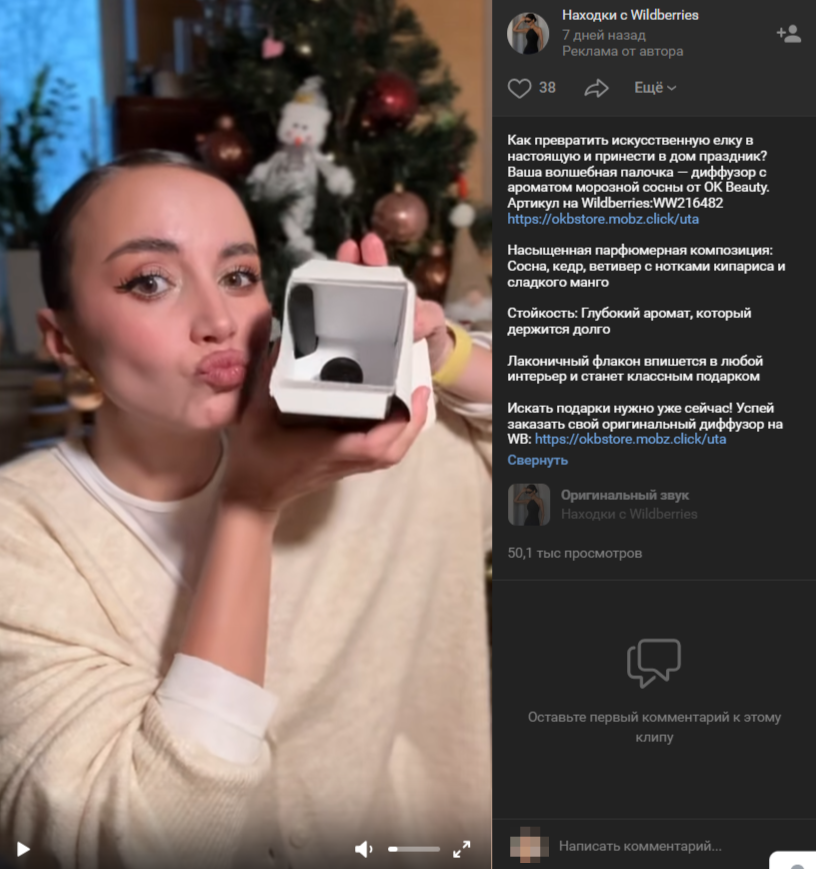 Кейс. Автор этого VK-клипа на камеру распаковывает диффузор для интерьера в уютной домашней атмосфере, подробно демонстрируя пользователям и упаковку, и сам товар, не забывая прикрепить ссылку на Wildberries: