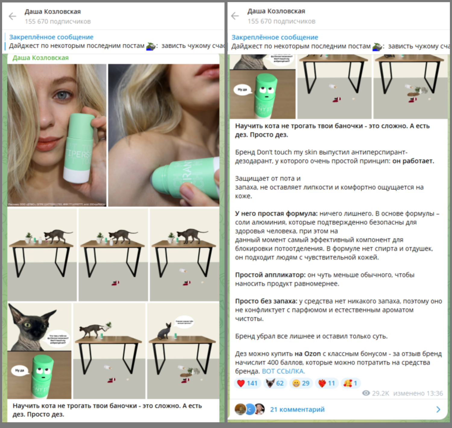 Кейс. Автор канала, которая регулярно выкладывает комиксы про своего кота, создала историю о том, как питомец скидывает вещи со стола. Среди разбросанных предметов в кадре органично «затесался» дезодорант, заказанный на Ozon. Так товар стал частью шутливого сюжета, который подписчики восприняли как естественную деталь контента: