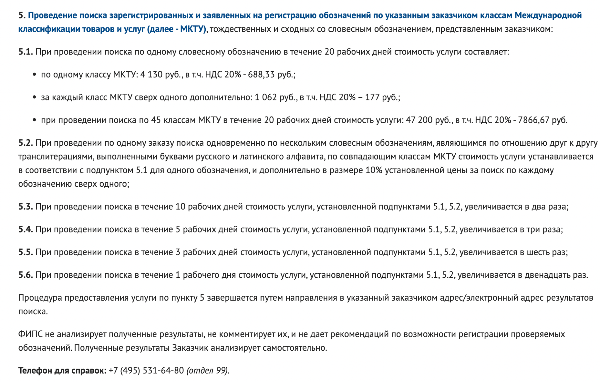 ФИПС (Федеральный институт промышленной собственности) делает официальную платную экспертизу поиска. Стоимость зависит от числа классов и срока исполнения: ускорение делает услугу значительно дороже. Смысл в том, что вы получите формальную выборку знаков, которые действительно могут помешать регистрации. Но и в этом случае анализ и принятие решения остаются за вами: если схожих знаков много и степень сходства высока, разумнее отказаться от идеи; если немного — можно подготовить аргументы или внести коррекции в обозначение.