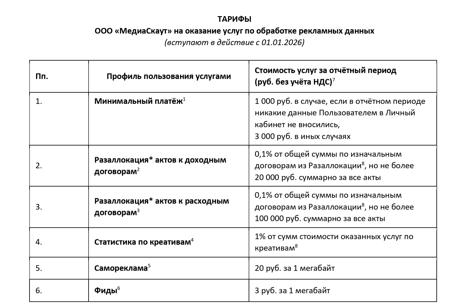 Существует базовый минимальный платеж за деятельность — 6000 ₽ (без НДС). Каждый 1 Мб загруженных креативов саморекламы стоит 15 ₽ (без НДС).