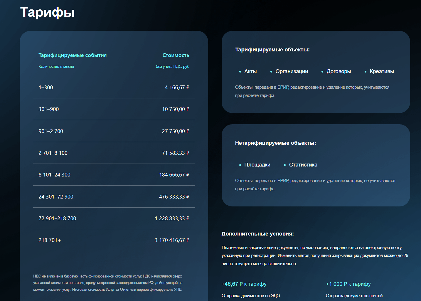 Цены зависят от количества тарифицируемых событий (акты, организации, договоры, креативы). При этом стоимость фиксированная для всего промежутка. Например, услуги ОРД будут стоить 4166,67 ₽ (без НДС) и при 1 объекте, и при 300.