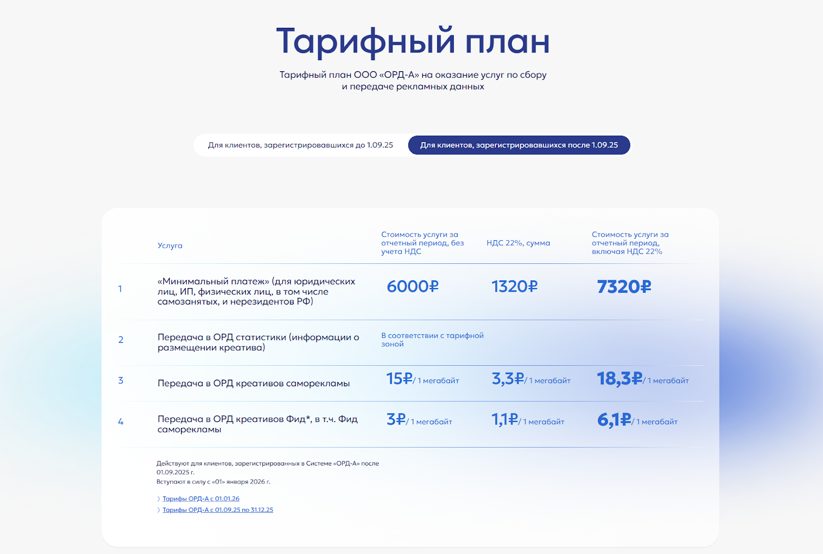 При этом рекламодатели, которые зарегистрировались до 01.09.2025, работают по другим тарифам — более дешевым.