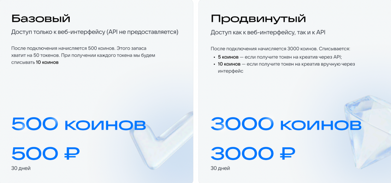 Цена зависит от объема загруженных креативов и числа полученных токенов.