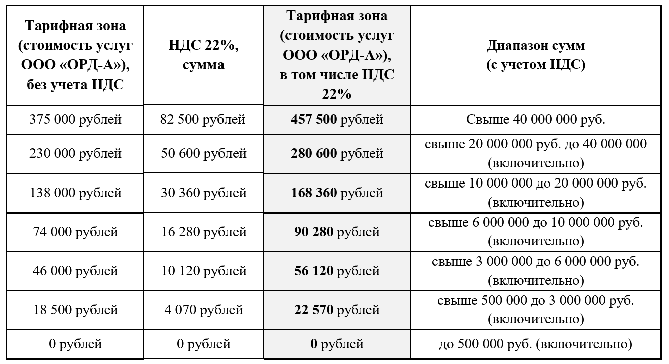 По общему правилу стоимость оказания услуг составляет:
