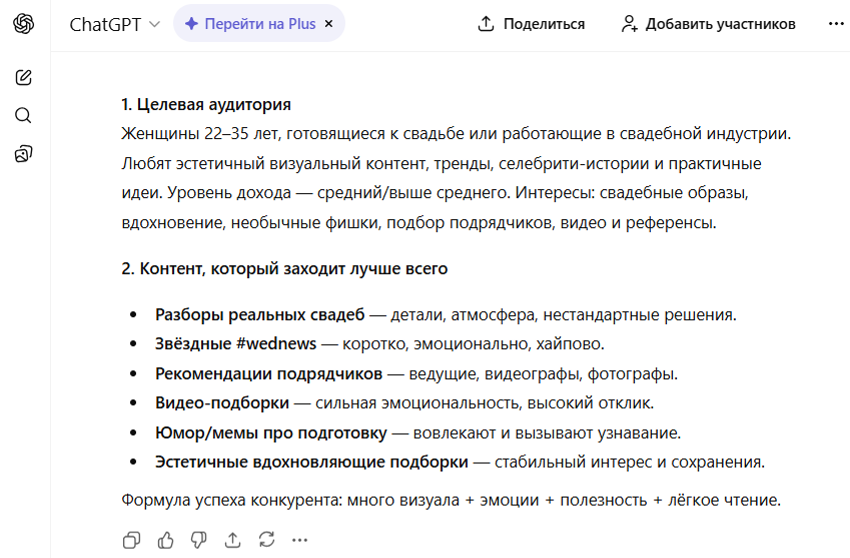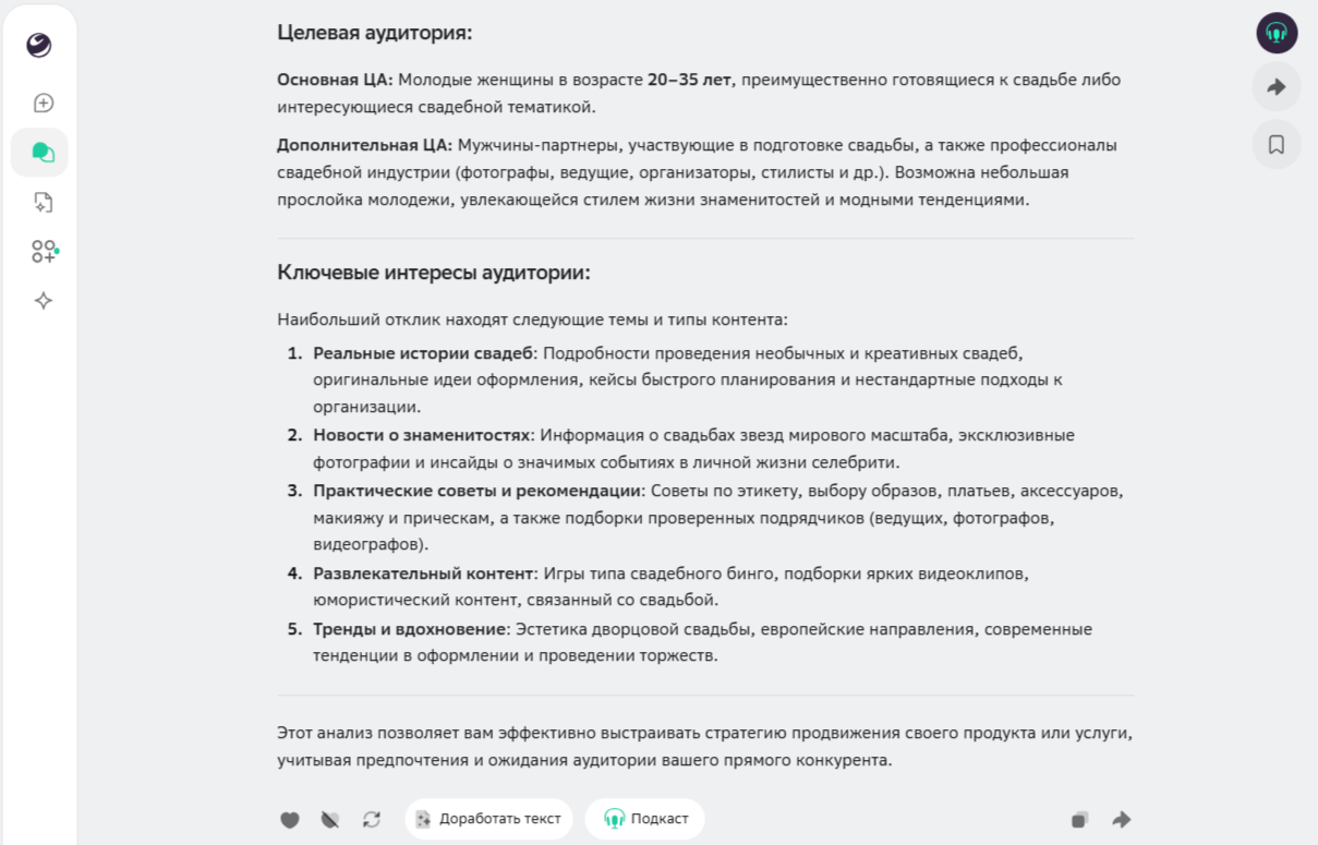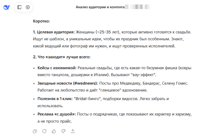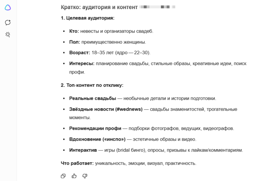 - все нейросети выделили ключевые темы для вовлечения: разборы реальных свадеб, новости о знаменитостях и рекомендации подрядчиков;