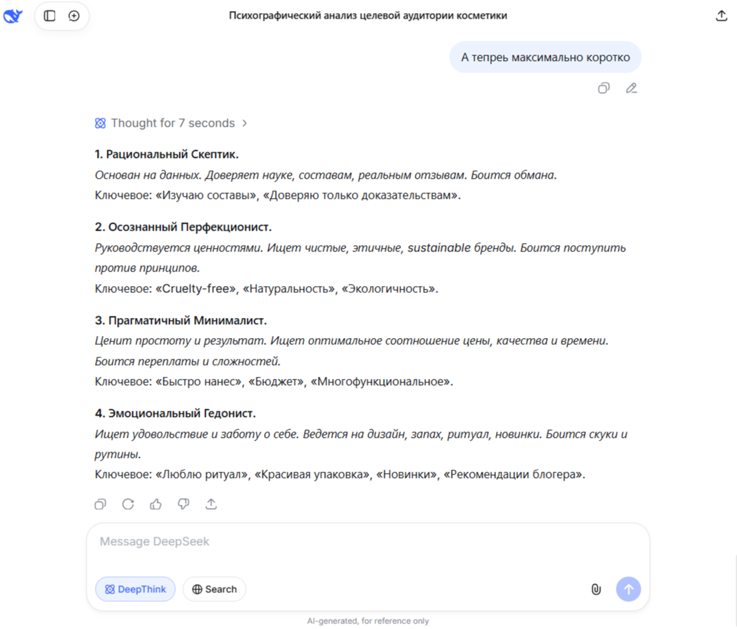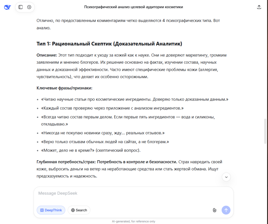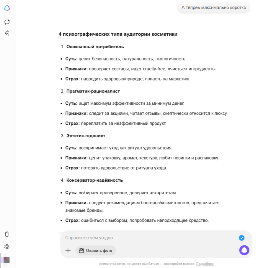 - YandexGPT подчеркнул страх разочароваться и рискнуть здоровьем кожи у «Консерваторов надежности».