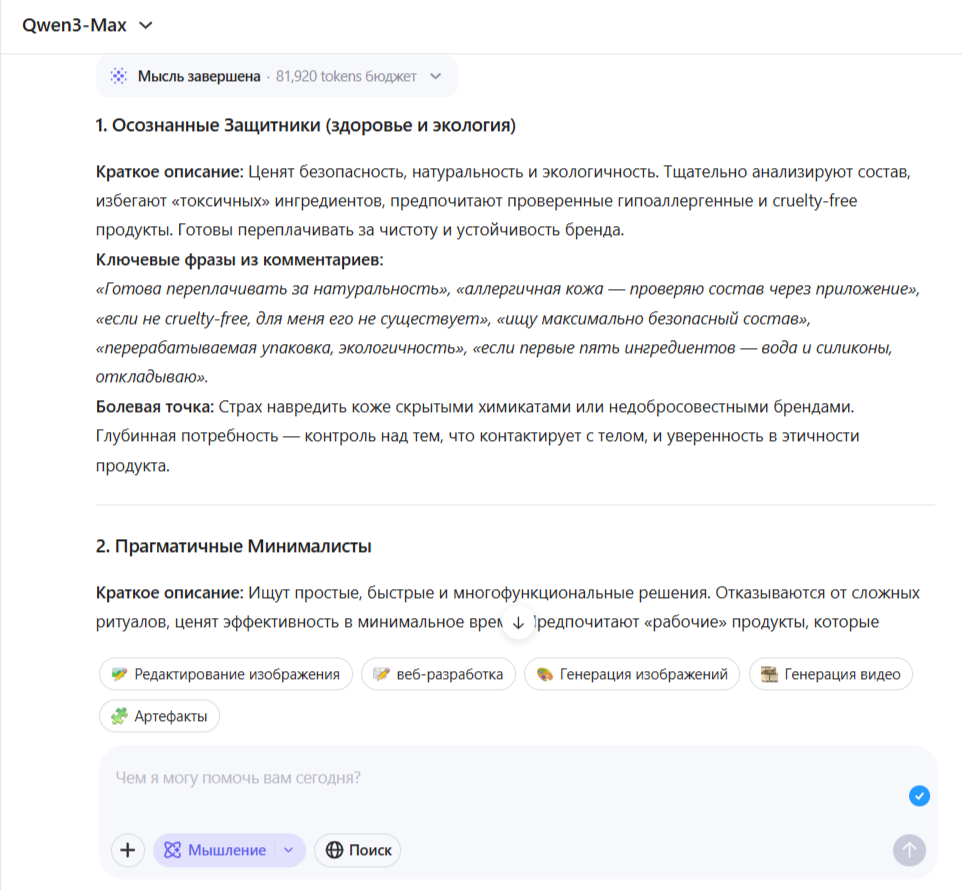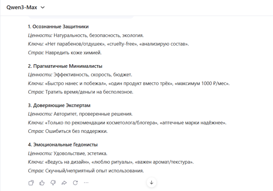 Qwen3-Max тоже выделил 4 группы, но описал их компактнее, чем другие нейросети: