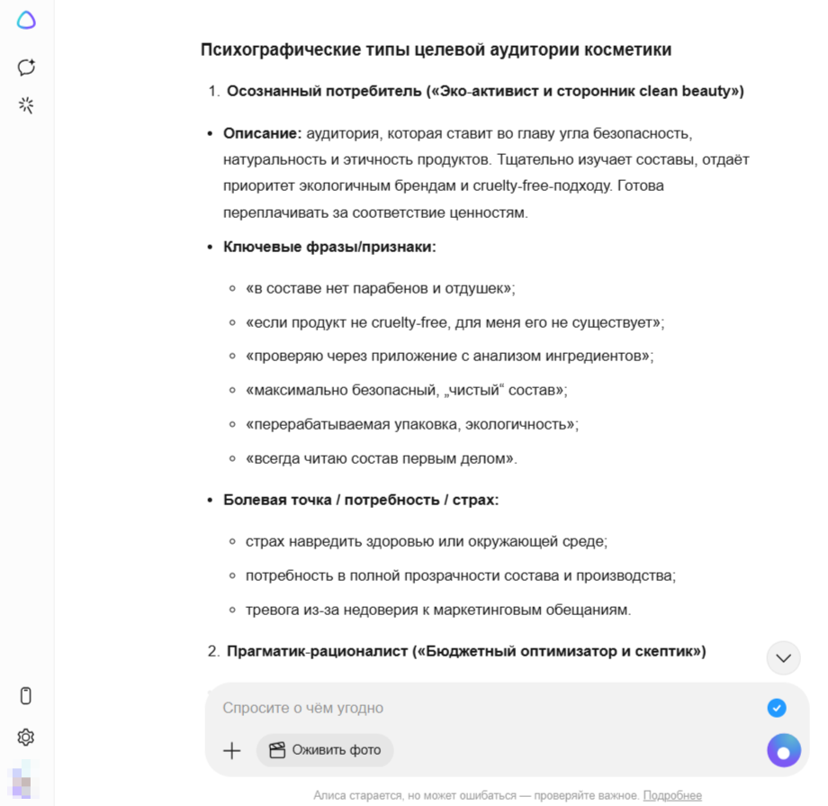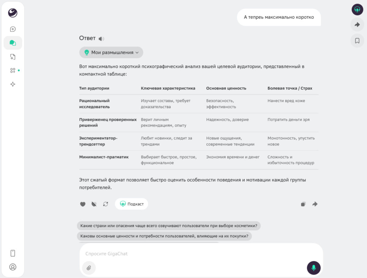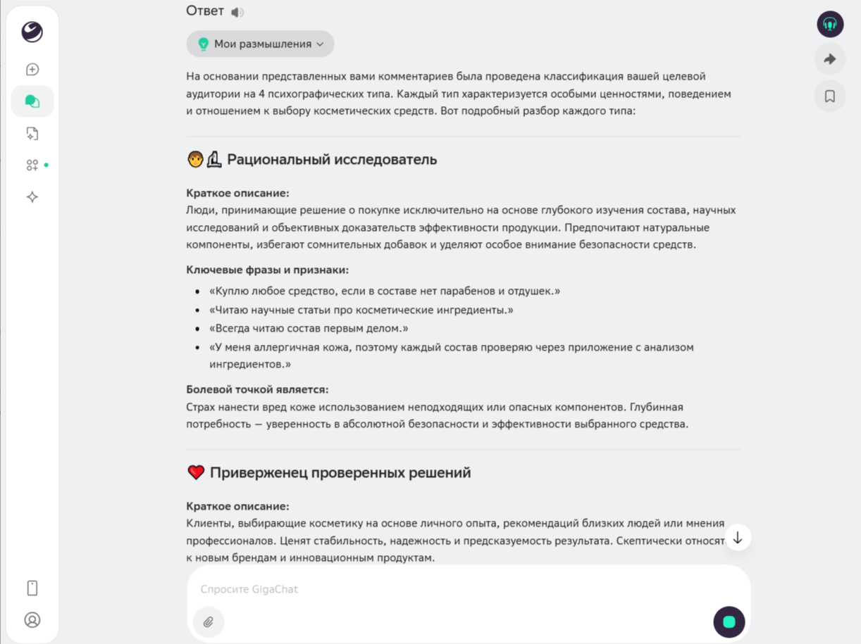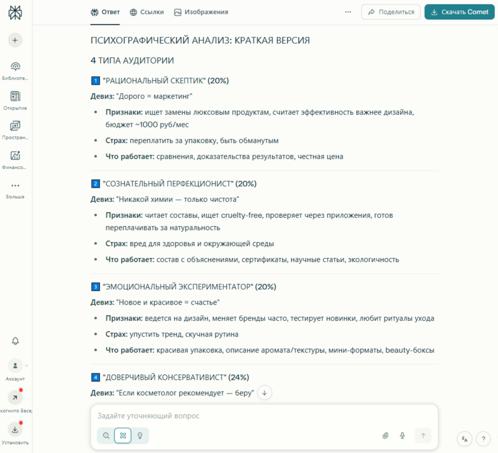 - Только Perplexity AI добавила количественные метрики (доли аудитории) и развернутый блок стратегических рекомендаций для маркетолога.