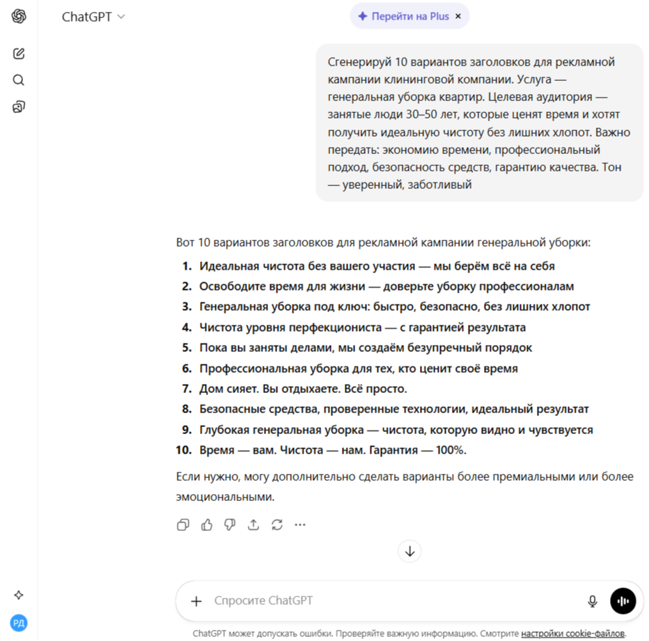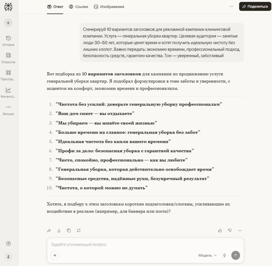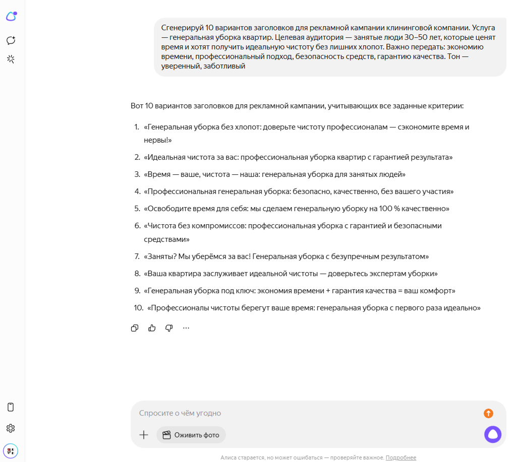 Задача. Сгенерировать 10 вариантов заголовков для рекламной кампании клининговой компании. Услуга — генеральная уборка квартир. Целевая аудитория — занятые люди 30–50 лет, которые ценят время и хотят получить идеальную чистоту без лишних хлопот. Важно передать: экономию времени, профессиональный подход, безопасность средств, гарантию качества. Тон — уверенный, заботливый.