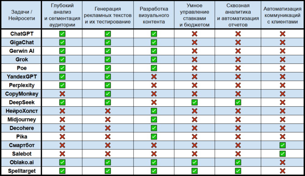 Для удобства составили сравнительную таблицу — какие из перечисленных AI-сервисов какие задачи закрывают: