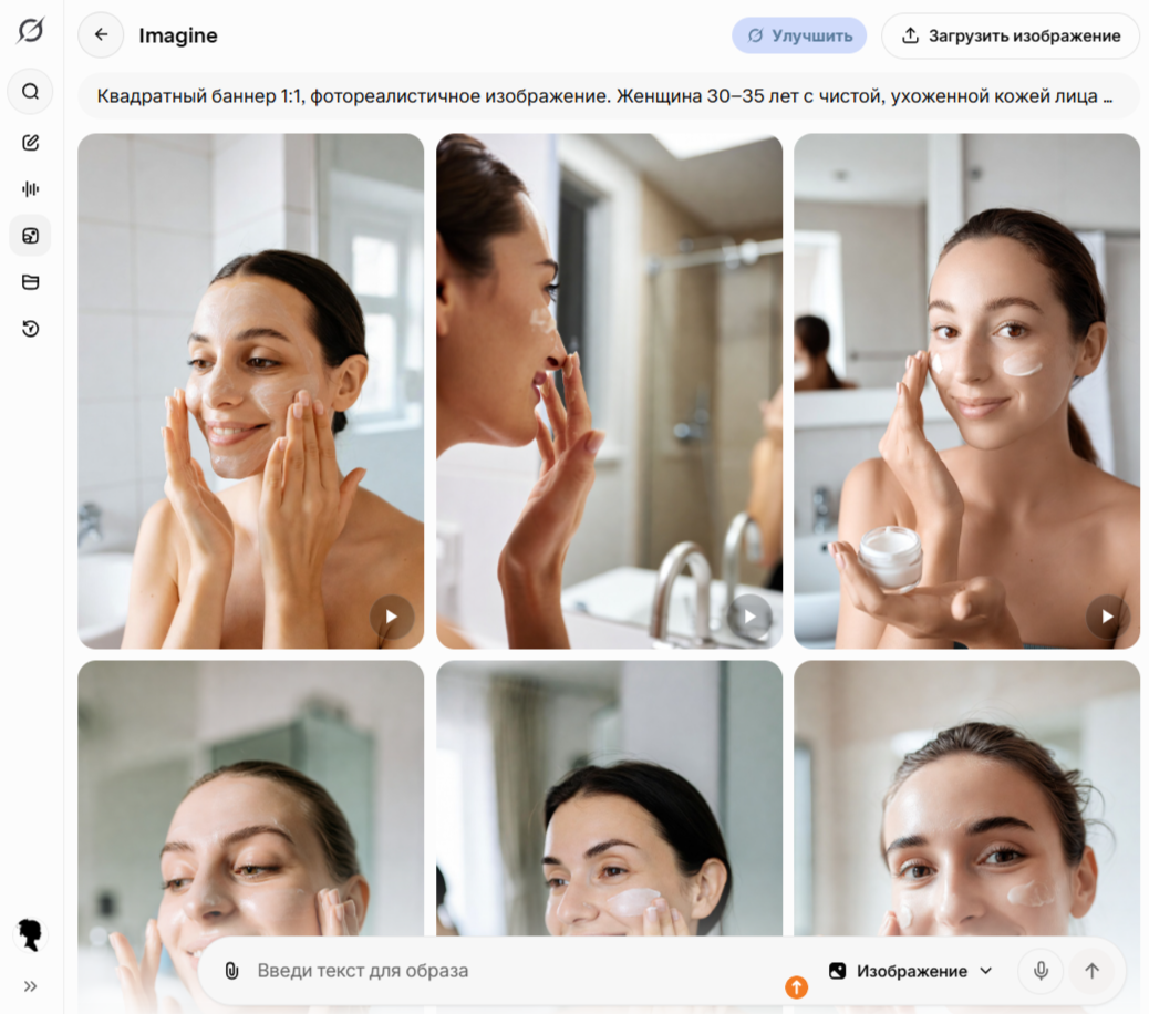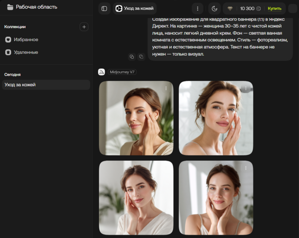 Задача. Создать изображение для квадратного баннера (1:1) в Яндекс Директе. На картинке — женщина 30–35 лет с чистой кожей лица, наносит легкий дневной крем. Фон — светлая ванная комната с естественным освещением. Стиль — фотореализм, уютная и естественная атмосфера. Текст на баннере не нужен — только визуал.