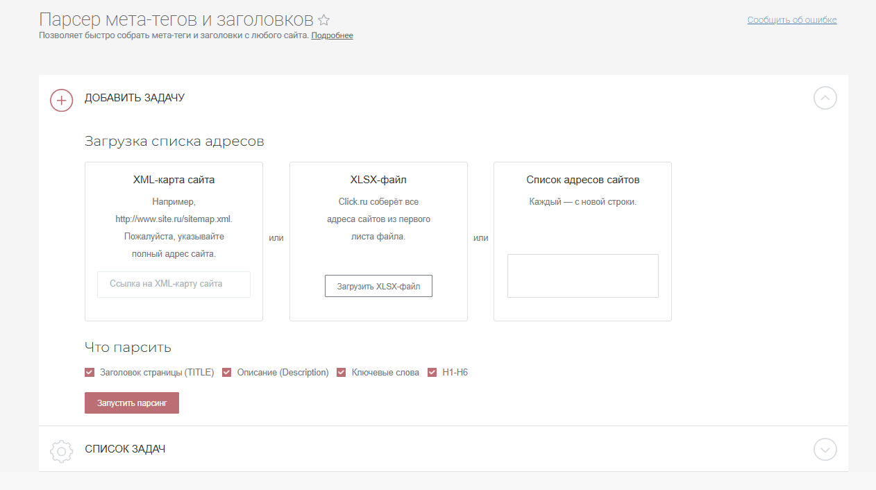 Инструмент для парсинга основных метатегов и заголовков Н1–Н6 с любого сайта. При работе с инструментом можно использовать XML-карты сайтов, XLSX-файлы или вводить адреса страниц вручную. Доступно 500 бесплатных пробных запросов. Парсер работает без ограничений на количество анализируемых страниц в сутки.