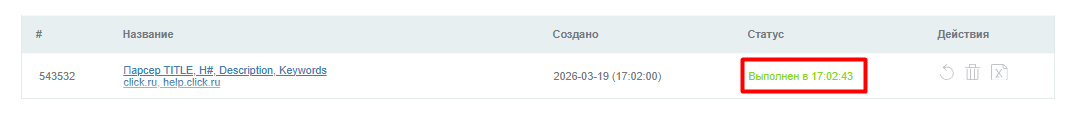 После завершения парсинга отчет появится в списке задач. Его можно скачать, когда статус изменится на «Выполнен».