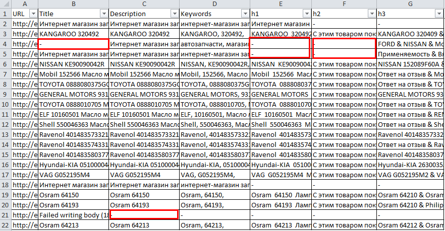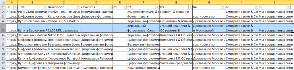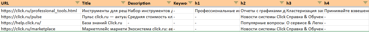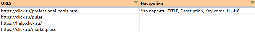 - результаты — таблица с адресами, метатегами и заголовками (если заголовков несколько, они указаны в одной ячейке через разделитель);