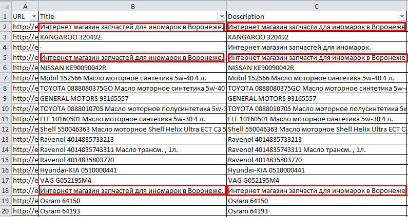 Иногда одинаковые title и description встречаются на разных страницах. Обычно это связано с ошибками в настройке сайта или CMS. Такие дубли можно легко найти в отчете, например, через условное форматирование в Excel. После этого важно переписать метатеги так, чтобы каждая страница имела уникальные формулировки.