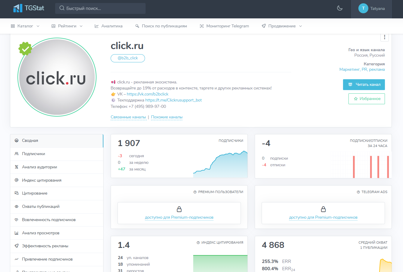 - Telemetr. Инструмент для поиска, мониторинга и глубокой аналитики Telegram-каналов. Помогает подбирать площадки для рекламы с гибкой фильтрацией, отслеживать рекламные размещения и упоминания брендов, анализировать активность аудитории в открытых и закрытых каналах, смотреть детальную статистику по подпискам и отпискам, а также оценивать динамику, ERR, индекс цитирования и рекламную эффективность.