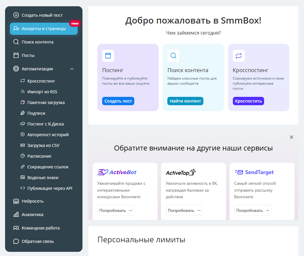 SmmBox. Сервис отложенного постинга и поиска популярного контента в соцсетях. Есть отложенный постинг по расписанию для сохранения охватов, анализ конкурентов и смежных ниш с подбором лучших постов по заданным критериям, встроенная нейросеть, которая пишет тексты для постов и обрабатывает изображения, пакетная загрузка файлов, постов. Поддерживает командную работу.
