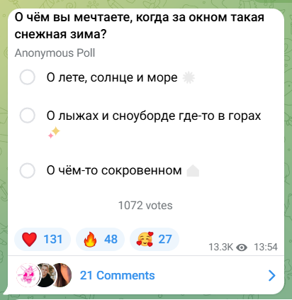 В Телеграме опросы работают как отдельные публикации. Есть 2 механики: сам опрос, в котором можно выбрать до нескольких ответов, и викторина, когда один из вариантов правильный, а все остальные — нет.