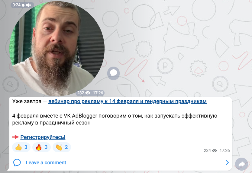 Видеокруг — аналог историй. Это может быть бэкстейдж (запись процесса «за сценой»), видео с мероприятия или прогулки, мнение эксперта, анонс мероприятия. Можно записать видеокруг онлайн или закруглить любое видео через бот Telescopy.