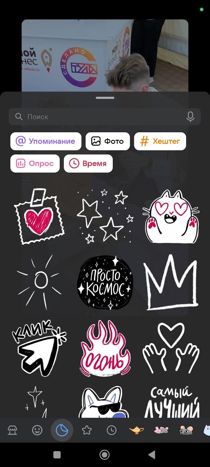 Вы можете добавить гифки, хештеги, время, фотографии, опрос, упоминания аккаунтов, веселые картинки. Этот инструмент подходит для разных целей: закрыть что-то на видео, подчеркнуть детали, подсказать, что в описании есть ссылка, дать ссылку на другой аккаунт и т. д.