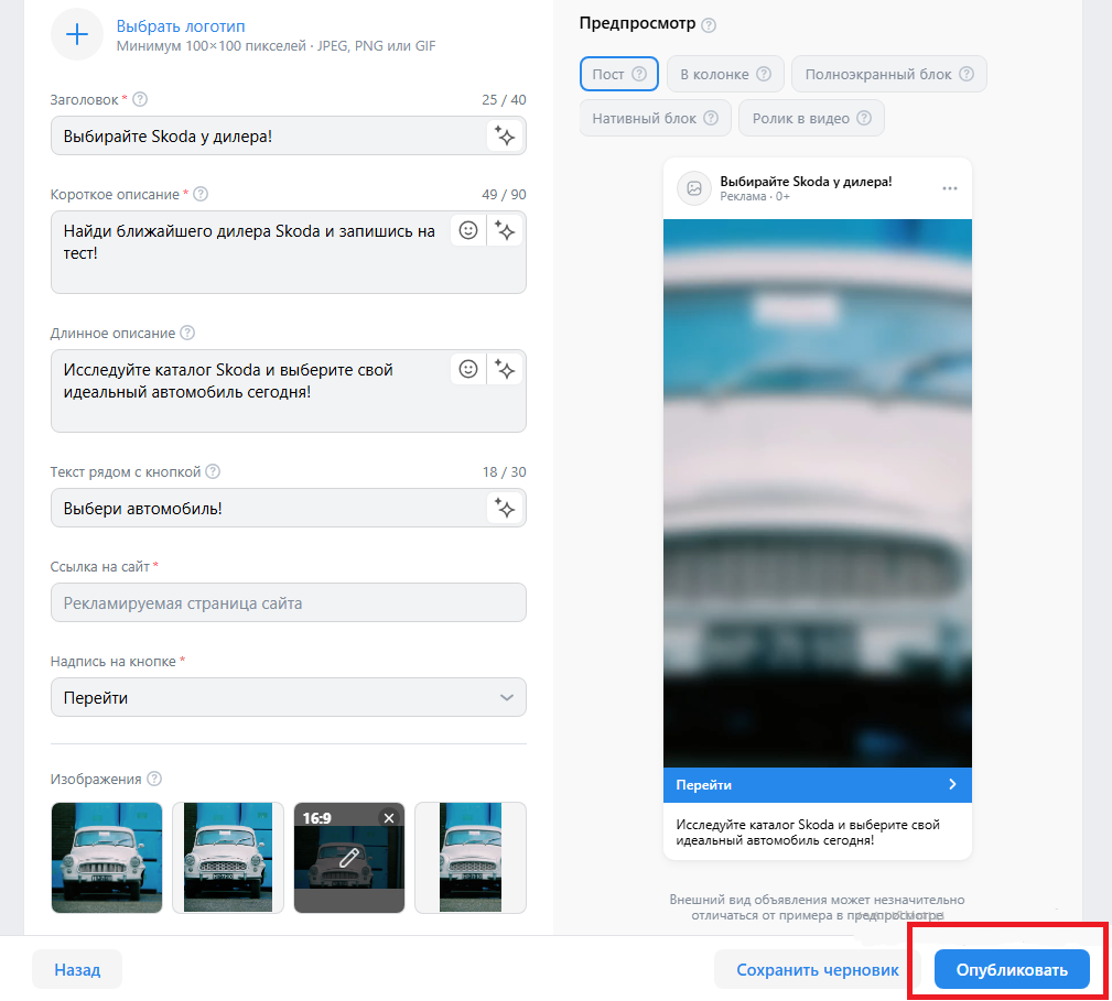 - тексты и визуал не содержат запрещенных формулировок и соответствуют требованиям системы;