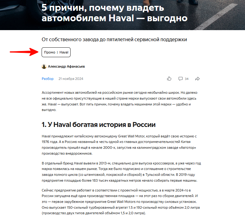 Редакция пишет материал на интересную аудитории тему (например, как выбрать кроссовер для семьи, как экономить на обслуживании или как изменился рынок электромобилей), а бренд интегрируется через два специальных промоблока. Первый — небольшой, до 700 символов, обычно в середине текста. Второй — больше, до 1500 символов, в конце статьи. В них можно разместить ссылки, логотип, короткий рассказ о продукте и одну фирменную иллюстрацию. Маркируются только эти блоки, а остальная часть текста остается полностью редакционной. Это делает интеграцию мягкой и естественной: читатель получает пользу и контекст, а бренд — узнаваемость и переходы по ссылкам.