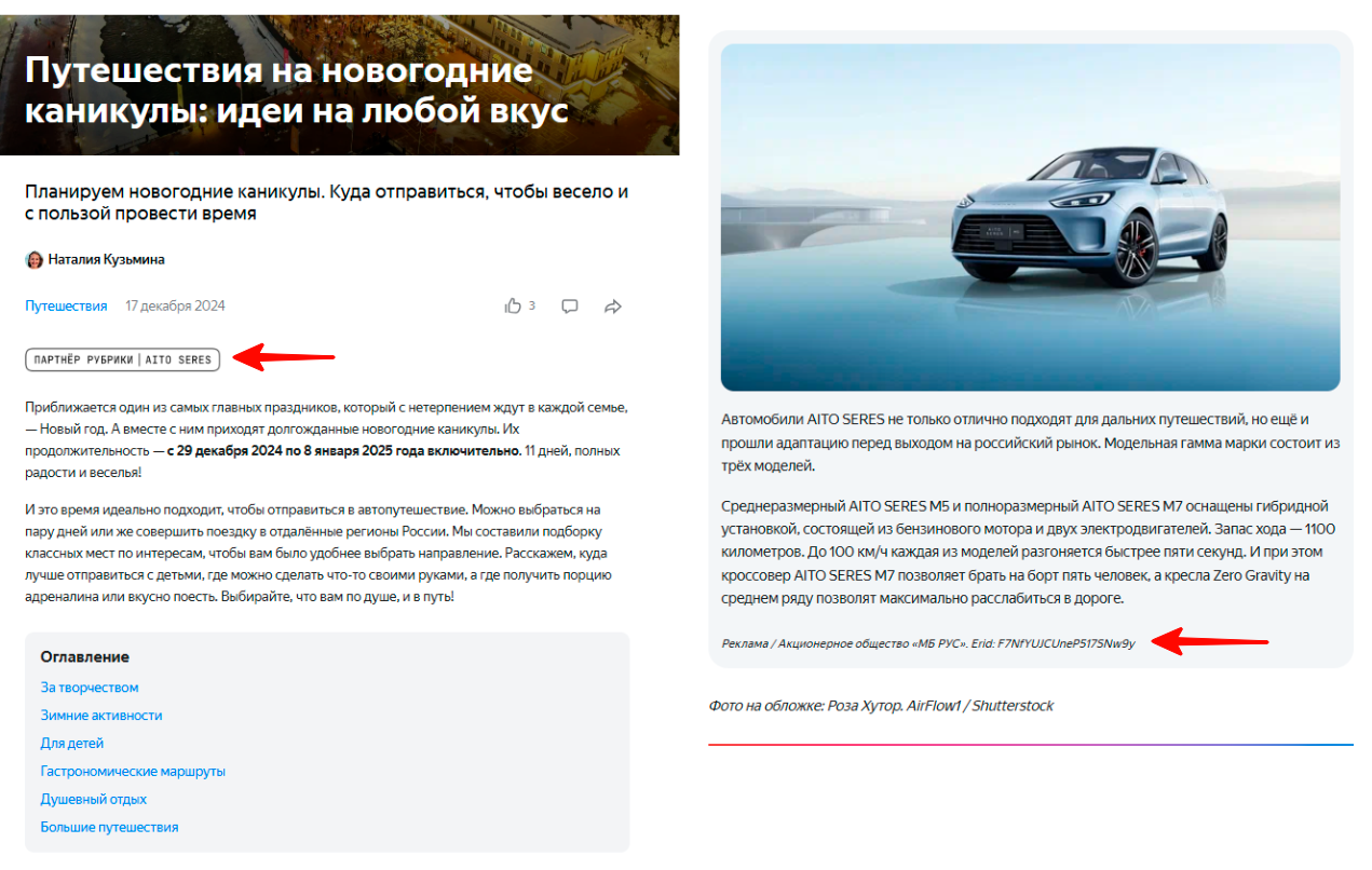 - Если бизнесу важно построить доверие, рассказать историю или объяснить преимущества продукта, работают контентные интеграции в журнале Авто.ру: статьи, спецпроекты, редакционные форматы и спонсорство рубрик.
