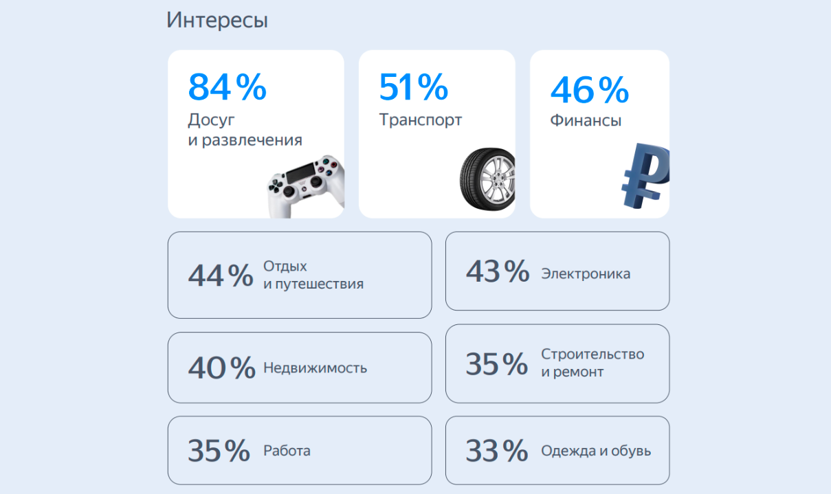 Помимо основных интересов, непосредственно связанных с автомобилями (сервис, страхование, кредиты), аудитория Авто.ру демонстрирует высокую вовлеченность в смежные и даже непрофильные темы. Это активные потребители с широким кругом интересов.